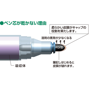 特殊インキの採用で、ペン芯の表面にインキの蒸発を抑える薄い皮膜ができ、キャップの役割を果たします。<br>