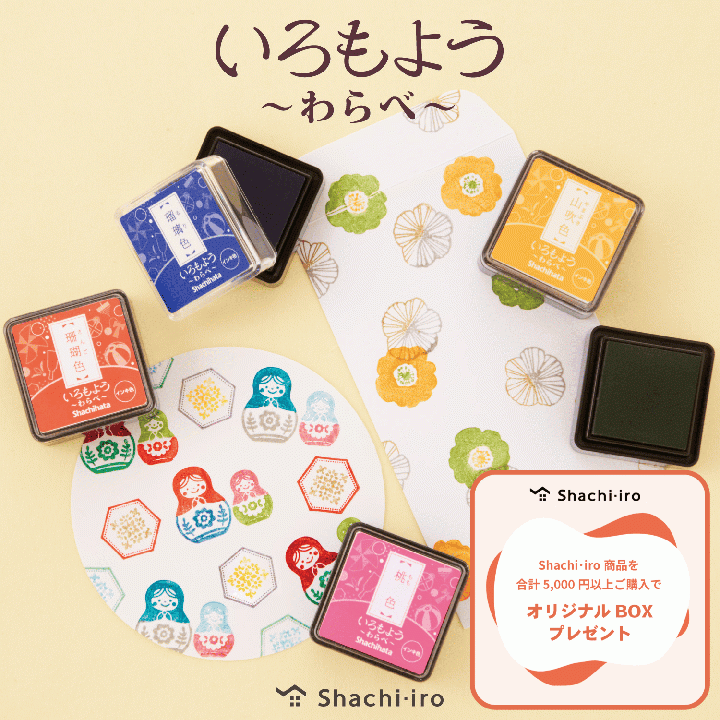消しゴムはんこなどのスタンプアートに使いやすい「いろもよう」は、盤面に軽く押すだけで、広い面から細かな線まで濃く、ムラなく、クッキリとした印影を出すことができるスタンプパッドです。<br> スタンプの色に込めたのは、同じ赤や青でも、それぞれ異なる明るさや濃淡へのこだわり。<br> 紅色(べにいろ)、瑠璃色(るりいろ)、銀鼠色(ぎんねずみいろ)など、日本の伝統色を名称に用いて、個性的で美しい「和の色彩」を楽しんでいただけます。<br><br> <b>乾きが早く、クッキリ鮮やか!</b><br> シヤチハタ独自のナノテクノロジーから生まれた油性顔料系インキを採用。スピーディーな乾燥時間に加え、色鮮やかでクッキリ濃い印影を実現しました。<br><br> <b>軽く押すだけでインキがしっかりつく</b><br> 極細繊維の盤面表布の採用により耐久性に優れ、盤面に軽く押すだけで鮮明な印影が得られます。印面についたインキは水で湿らせたティッシュ等で拭き取ることができます。<br><br> <b>パッドが乾燥しにくい</b><br> フタを開けたままでも、パッドは乾燥しません。こまめなフタの開け閉めが不要なのでアート作品づくりでも便利です。<br><br> <b>重ねて保管ができるので省スペース</b><br> スタンプパッドは重ねることができるので、場所を取らずに省スペースで保管できます。<br><br> <b>インキ色一覧/INK COLOR</b><br> 紅色(べにいろ/Red)<br> 牡丹色(ぼたんいろ/Pink)<br> 山吹色(やまぶきいろ/Chrome Yellow)<br> 朽葉色(くちばいろ/Ocher Green)<br> 松葉色(まつばいろ/Dark Yellow Green)<br> 常磐色(ときわいろ/Green)<br> 浅葱色(あさぎいろ/Turquoise)<br> 瑠璃色(るりいろ/Blue)<br> 菖蒲色(しょうぶいろ/Red Violet)<br> 栗色(くりいろ/Brown)<br> 銀鼠色(ぎんねずいろ/Grey)<br> 墨色(すみいろ/Black)<br> 珊瑚色(さんごいろ/Orange)<br> 桃色(ももいろ/Light Pink)<br> 鴇色(ときいろ/Pale Pink)<br> 向日葵色(ひまわりいろ/Yellow)<br> 萌黄色(もえぎいろ/Yellow Green)<br> 若竹色(わかたけいろ/Pale Green)<br> 水色(みずいろ/Pale Blue)<br> 露草色(つゆくさいろ/Light Blue)<br> 縹色(はなだいろ/Cobalt Blue)<br> 藤色(ふじいろ/Pale Violet)<br> 砂色(すないろ/Pale Brown)<br> 桧皮色(ひわだいろ/Light Brown)<br> 紺青色(こんじょういろ/Dark Blue)<br> 木賊色(とくさいろ/Dark Green)<br> 茜色(あかねいろ/Dark Red)<br> 紅梅色(こうばいいろ/Light Pale Pink)<br> 蜜柑色(みかんいろ/Warm Yellow)<br> 琥珀色(こはくいろ/Amber)<br> 鬱金色(うこんいろ/Turmeric Yellow)<br> 麹塵色(きくじんいろ/Deep Dark Green)<br> 舛花色(ますはないろ/Classy Blue)<br> 亜麻色(あまいろ/Pale Grey)<br>