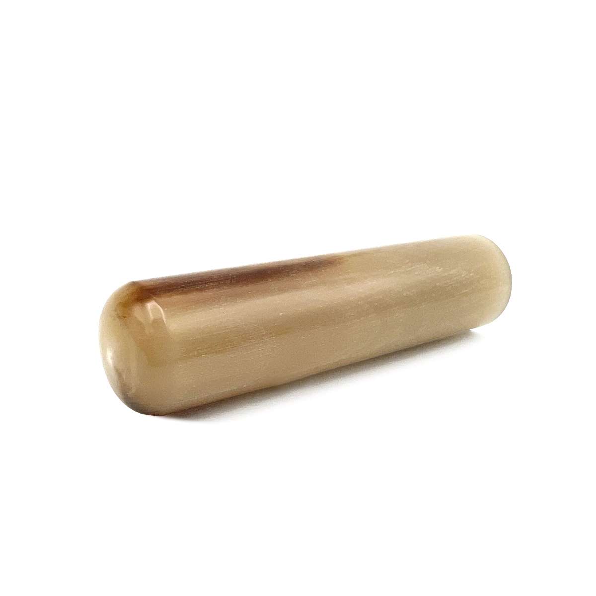 陸牛の角の印材で淡いクリーム色と茶色の班が混ざり合うマーブル模様をしています。天然素材のため1本1本が異なる模様をしているのが特徴です。