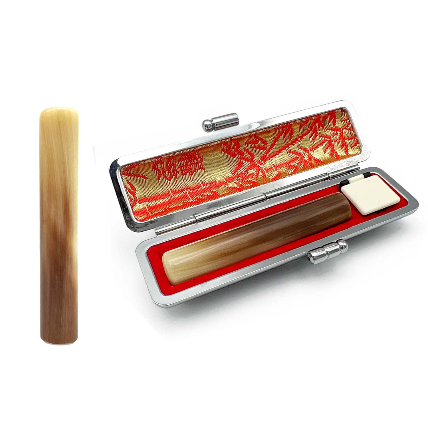 陸牛の角の印材で淡いクリーム色と茶色の班が混ざり合うマーブル模様をしています。天然素材のため1本1本が異なる模様をしており、より濃淡がはっきりでているのが特徴です。