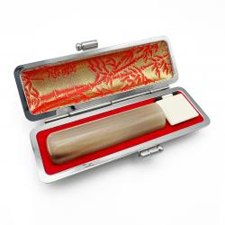 陸牛の角の印材で淡いクリーム色と茶色の班が混ざり合うマーブル模様をしています。天然素材のため1本1本が異なる模様をしているのが特徴です。