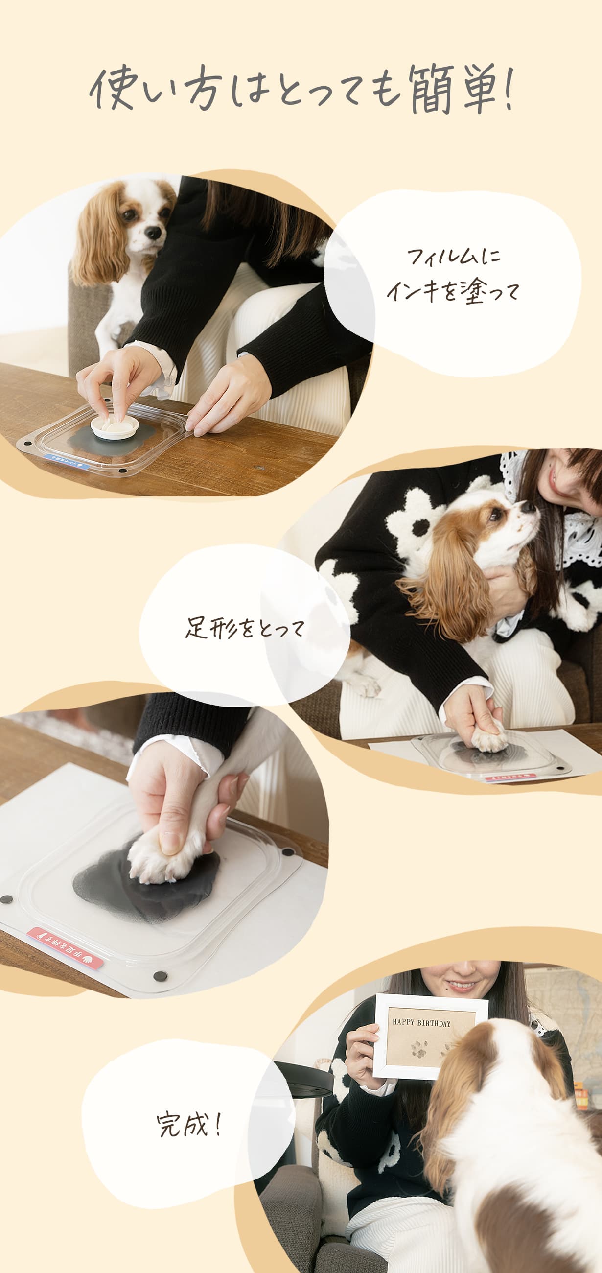 <b>※足型をとる前に、肉球周りの毛が伸びている場合は、トリミングをしてから押すとよりきれいな足形が取れます。</b><br>
