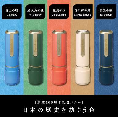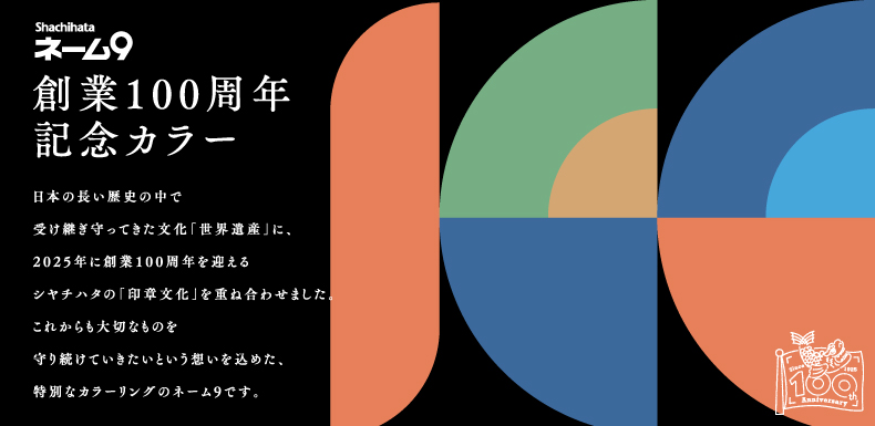 シャチハタ様 100周年おめでとうございます。長年お世話になっておりますネーム9の記念カラーを購入致しました。大切に使いたいと思っております。今後とも、よろしくお願い申し上げます。