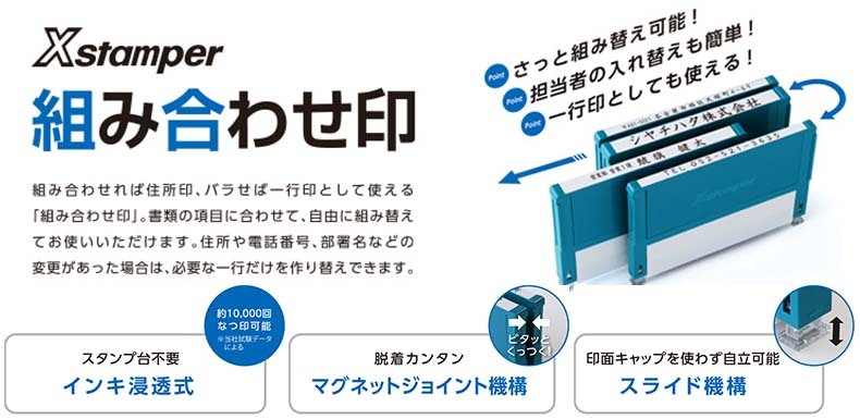 印面キャップを外して立てても印面のインキが紙に付かない、自立式スライド機構を採用。<br>