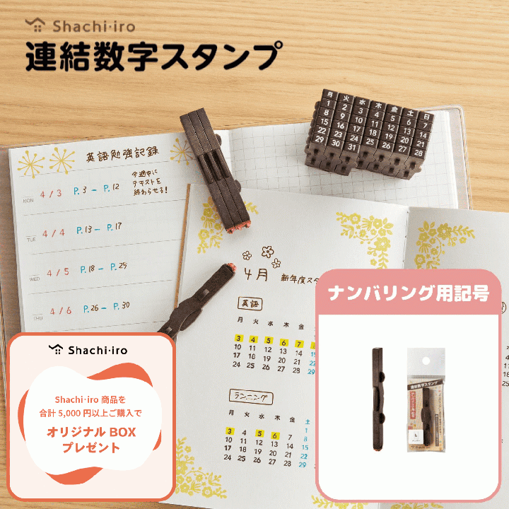 お手持ちのノートや手帳への記録が便利にできる 組み替え自由なスタンプ。<br> ページ番号や日付が押せる「ナンバリング」と、習慣の記録などに使える「万年カレンダー」があります。<br> 凸凹部をはめ合わせ、縦にも横にも連結できます。<br> 柄の上下を逆さまに連結すると空白として使用できます。 <br><br> ●ナンバリング<br> 000〜443までの連番と日付に対応しています。<br> 印面サイズ:3.2✕2.3mm(1本)<br><br> ●ナンバリング用記号<br> ナンバリングに追加して使える記号です。<br> <font color="e40850">※万年カレンダーには使用できません。</font> <br> 印面サイズ:3.2✕2.3mm<br><br> ※スタンプ台は別売りです。<br>※インキは内蔵していません。